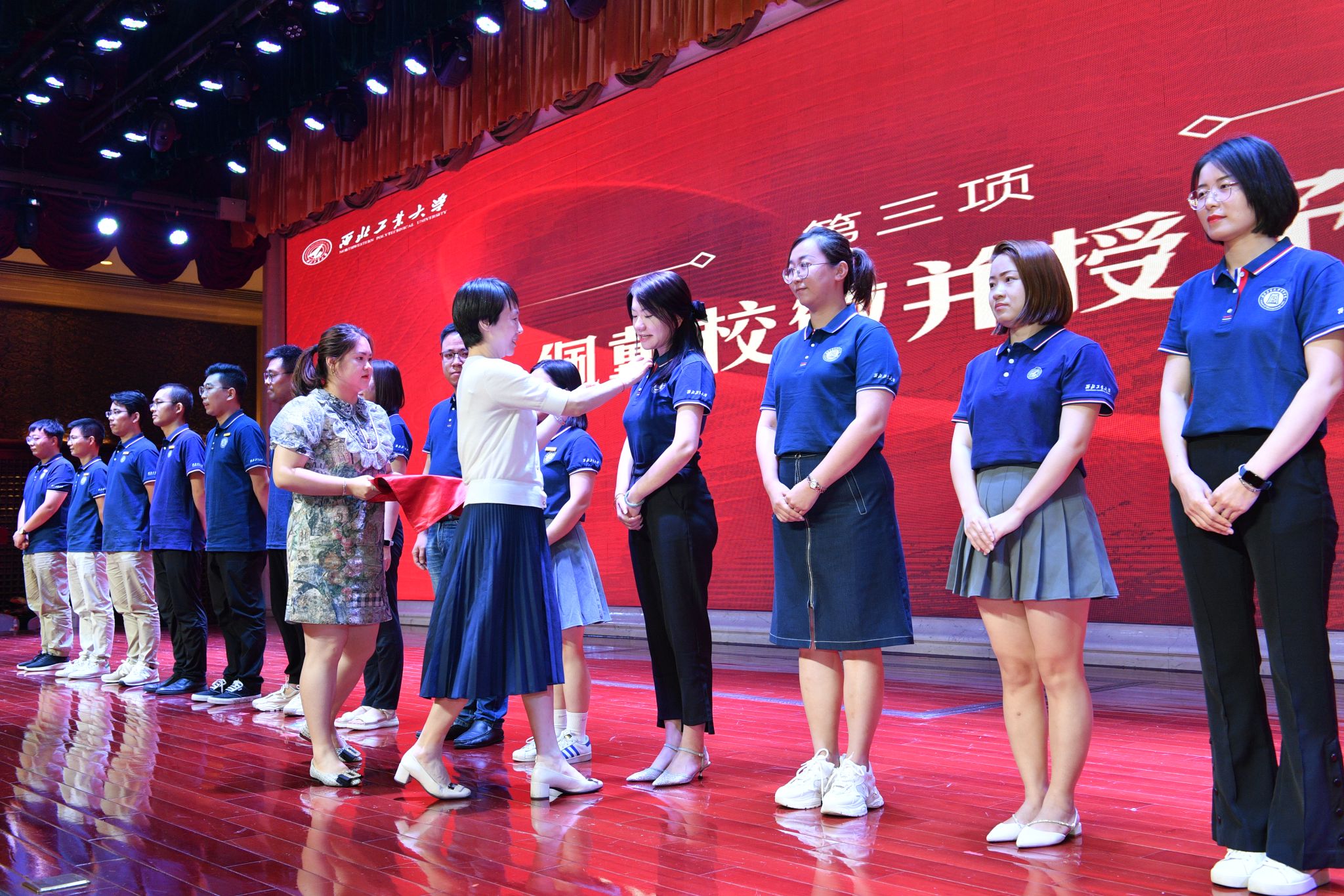 典礼上,党委书记乔彩燕为新生代表佩戴小奶猫直播 校徽。