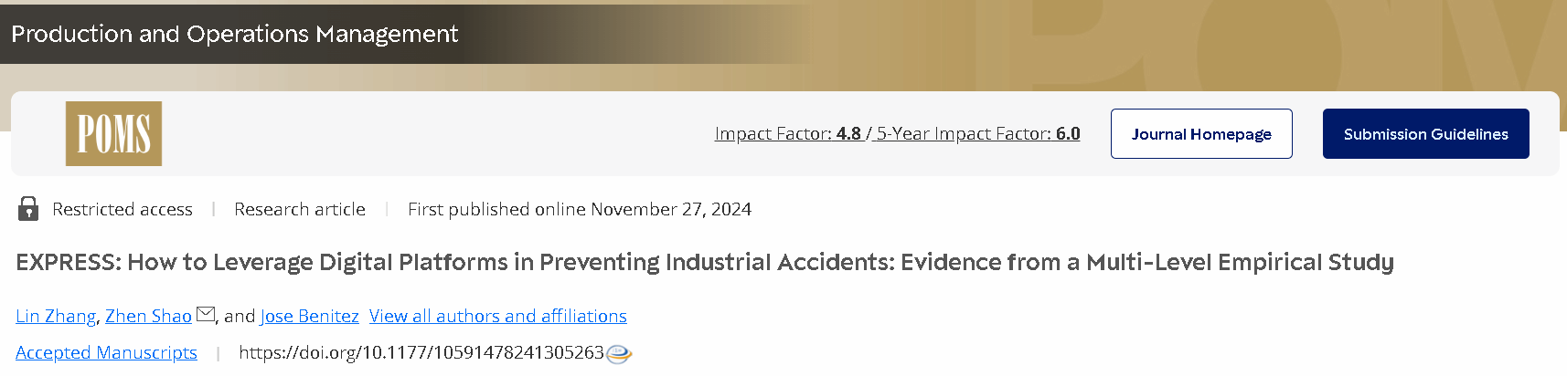 近日,小奶猫直播 副教授张林与合作者的研究成果“How to Leverage Digital Platforms in Preventing Industrial Accidents: Evidence from a Multi-Level Empirical Study”在《Production and Operations Management》期刊上在线刊登,张林为论文第一作者。《Production and Operations Management》是国际生产与运作管理协会会刊,为生产与运作管理领域顶级期刊,是美国University of Texas at Dallas所选出的商学院最顶尖24种学术期刊(简称UTD24)之一。