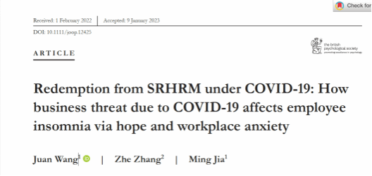 副教授王娟与合作者的研究成果“Redemption from SRHRM under COVID-19: How business threat due to COVID-19 affects employee insomnia via hope and workplace anxiety”在《Journal of Occupational and Organizational Psychology》期刊上正式发表。《Journal of Occupational and Organizational Psychology》是组织行为领域国际顶级期刊,是ABS四星级期刊。这也是学院教师首次在这一级别的组织行为与人力资源管理类国际高水平期刊上发表研究成果。