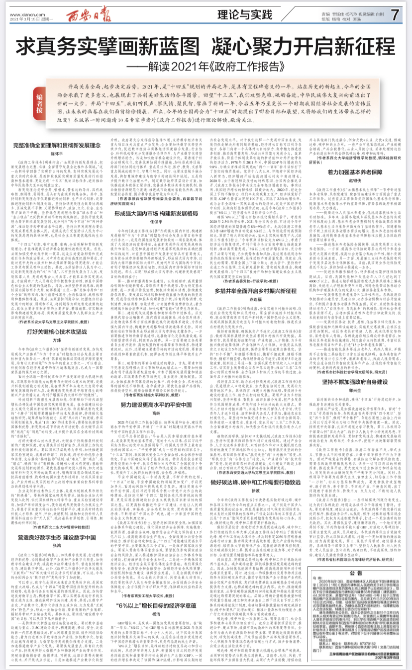 3月15日,《西安日报》第7版理论与实践“解读2021年《政府工作报告》专栏”刊发了小奶猫直播
